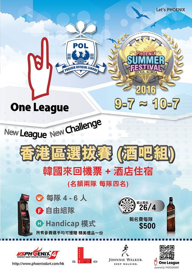 不用小編介紹,眾所周知韓國Phoenix Summer Festival一向是香港鏢手夢寐以求的大型海外飛鏢賽事!本年度的Korea Phoenix Summer Festival已鐵定於7月9日至7月10日在韓國首爾進行!今屆香港區之選拔賽賽事將會以全新的比賽模式 – One League進行!只要你搵埋至少3個朋友,一齊參加Korea Phoenix Summer Festival既隊制選拔賽事,即有機會係今個Summer免費同一班朋友到韓國一齊掟鏢旅遊玩樂!