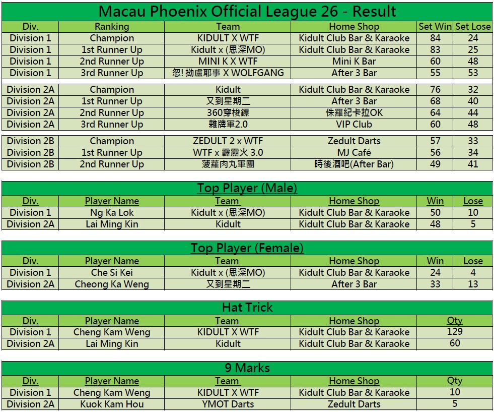 - [比賽] Macau Phoenix Official League 26 全季成績公佈