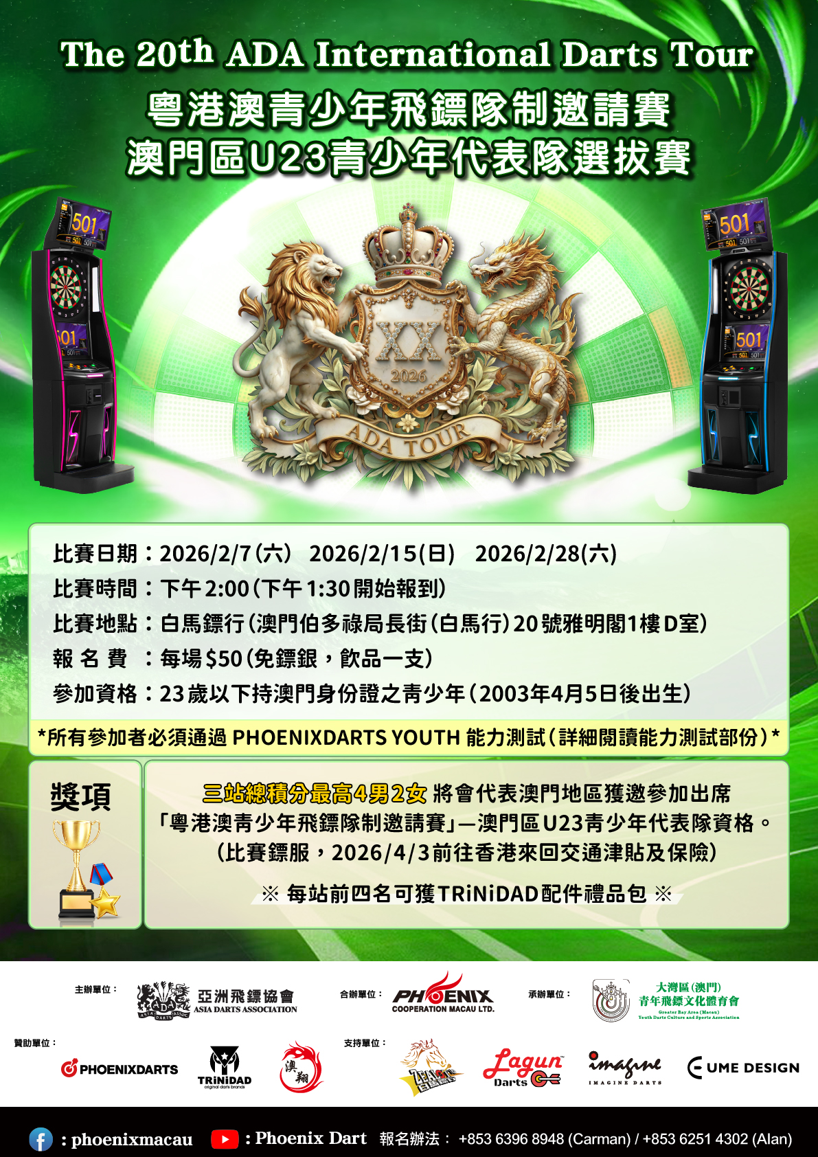 [比賽] 粵港澳青少年飛鏢隊制邀請賽 <澳門區U23青少年代表隊選拔賽> 2026-01-09 詳情請瀏覽以下PDF: ▼ 生力清啤 Macau Phoenix Official League 27現正接受報名 2026-01-09 清單