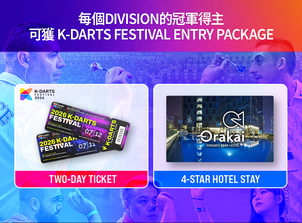 各組別的National Final冠軍,將獲贈 2026 K-DARTS FESTIVAL Entry Package! (K-Darts package 僅限得獎者本人領取,不得轉讓。) (酒店住宿將安排雙人房。若有親友陪同,其參賽通行證及住宿費用需由玩家另行支付。) 活動期間:2026年7月11日(星期六)~ 7月12日(星期日) 地點: Song-do Convenisa 3,4 Hall 123, Central-ro, Yeonsu-gu, Incheon ※ 今年的酒店地點視情況可能有所調整。 |