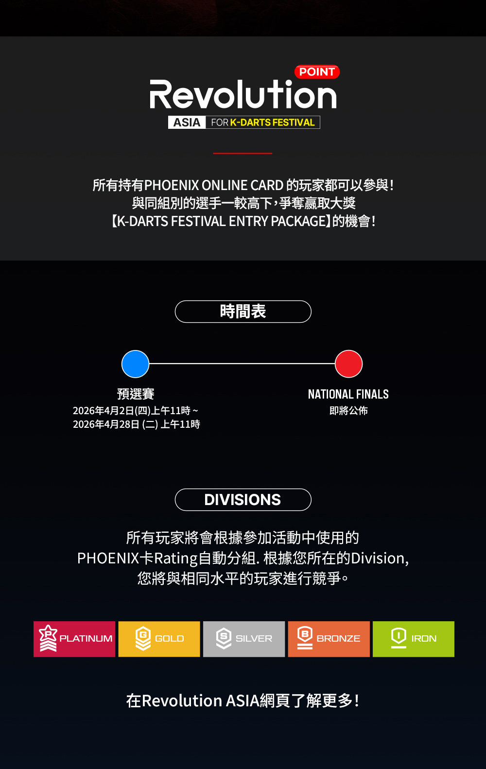 | Revolution ASIA 預選賽 | 2026年4月2日(四)上午11時 ~ 2026年4月28日 (二) 上午11時 | 任何擁有並已註冊Phoenix Online Card的玩家。 | 有VSX、VS4、VSS或VSP機台的Phoenix設置店 |