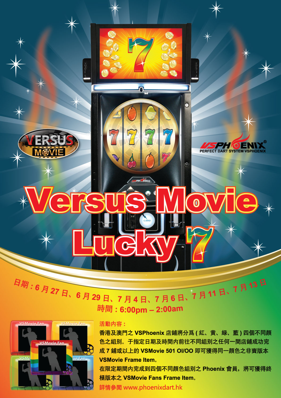 香港及澳門之VSPhoenix 店舖將分為(紅、黃、綠、藍)四個不同顏色之組別。於指定日期及時間內前往不同組別之任何一間店舖成功完成7舖或以上的Singles VSMovie 501 OI/OO 即可獲得同一顏色之非賣版本VSMovie Frame Item。
