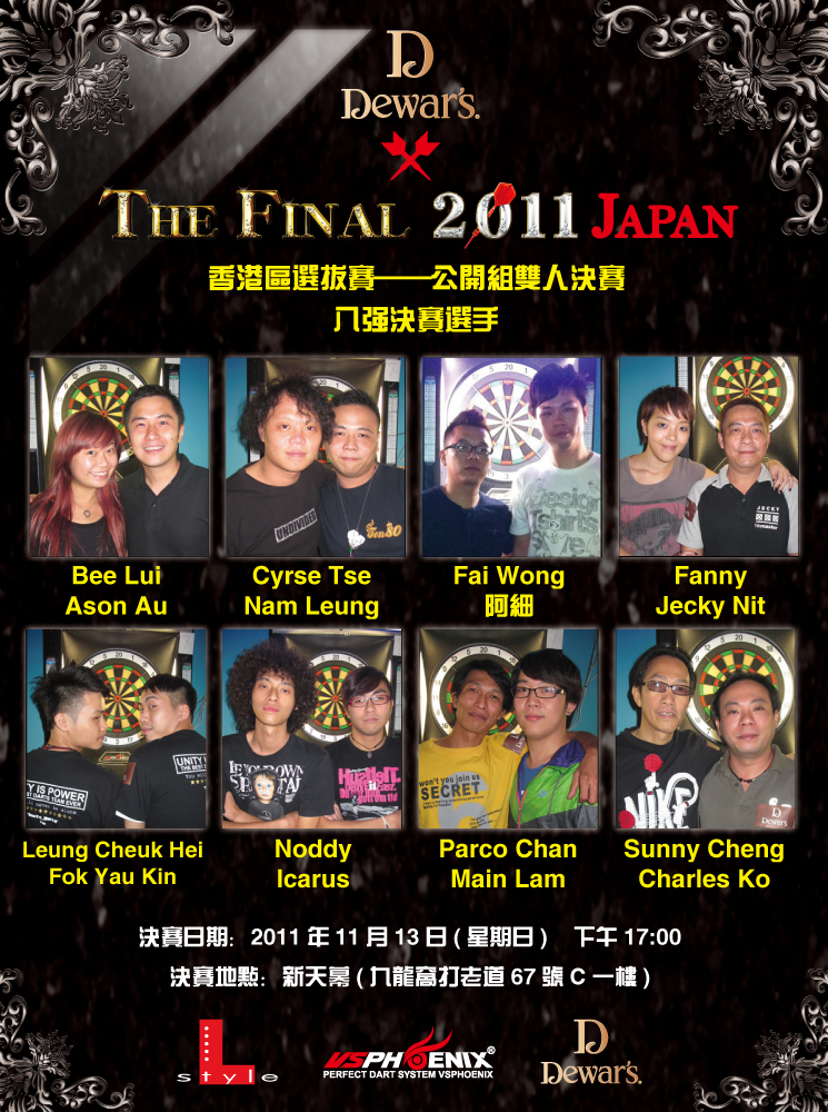 Dewar’s x The Final 2011 Japan 香港區選拔賽 – 公開組雙人賽初賽已於11月6日在鏢藝社進行, 當天共有二十隊隊伍分成小組進行比賽,每組也勢均力敵,經過兩輪小組淘汰賽後,淨下八隊選手晉身決賽,晉級隊伍名單如下: