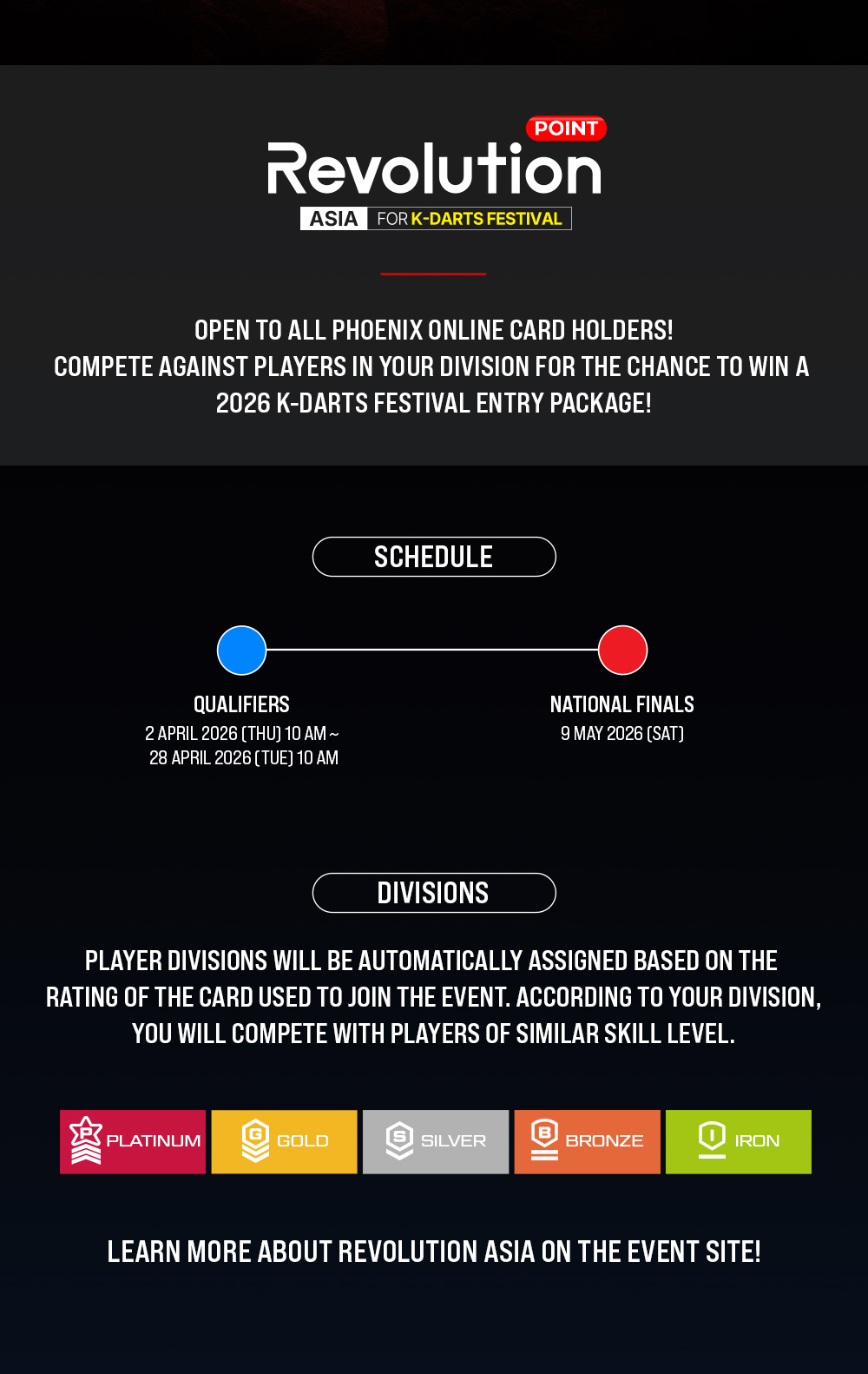 Example) If A account (Card 1) is ranked 10th in BRONZE, and A account (Card 2) is ranked 16th in BRONZE, only Card 1 will be recognized → The player ranked 33rd will advance to the National Finals. - 3.Participants in the Revolution ASIA must make sure to complete their PHOENIXDARTS membership registration. If incomplete, they not be eligible for rewards or the National Finals.