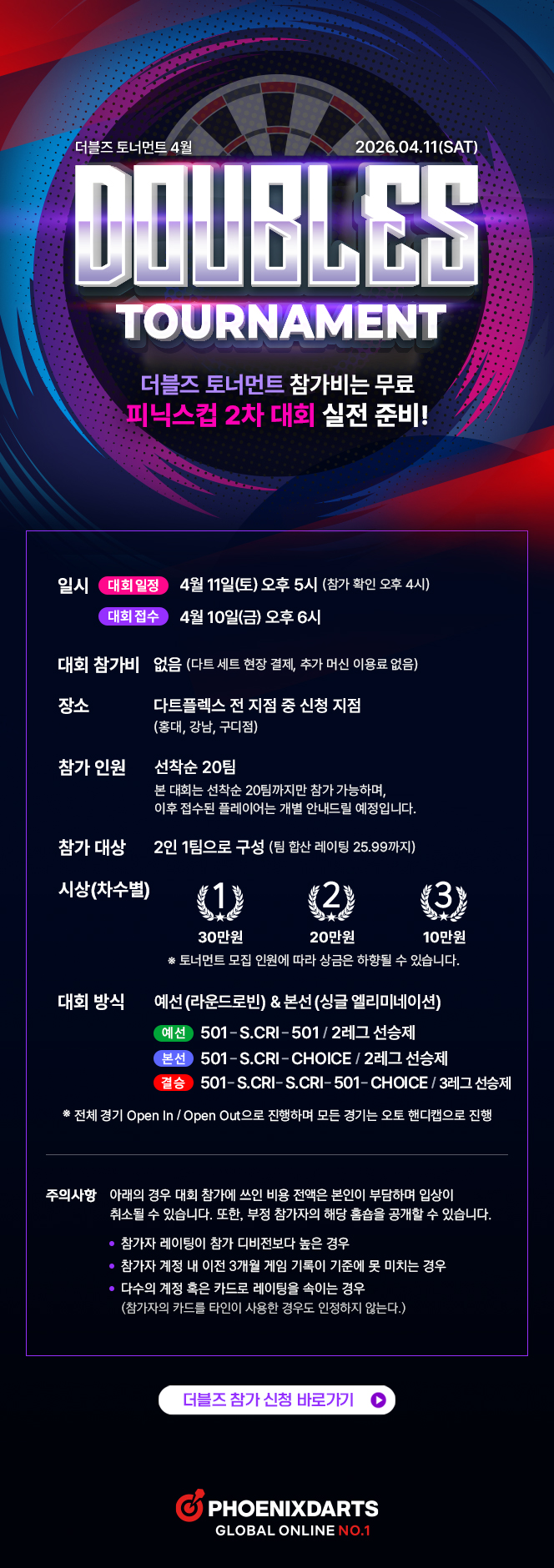 [イベント] 2026년 4월 다트플렉스 더블즈 토너먼트 2026-03-30 피닉스다트 벚꽃 봄 소풍 ▲ 2026-04-01 ▼ 퍼펙트 코리아(G-3) 진행방법 2026-03-25 一覧