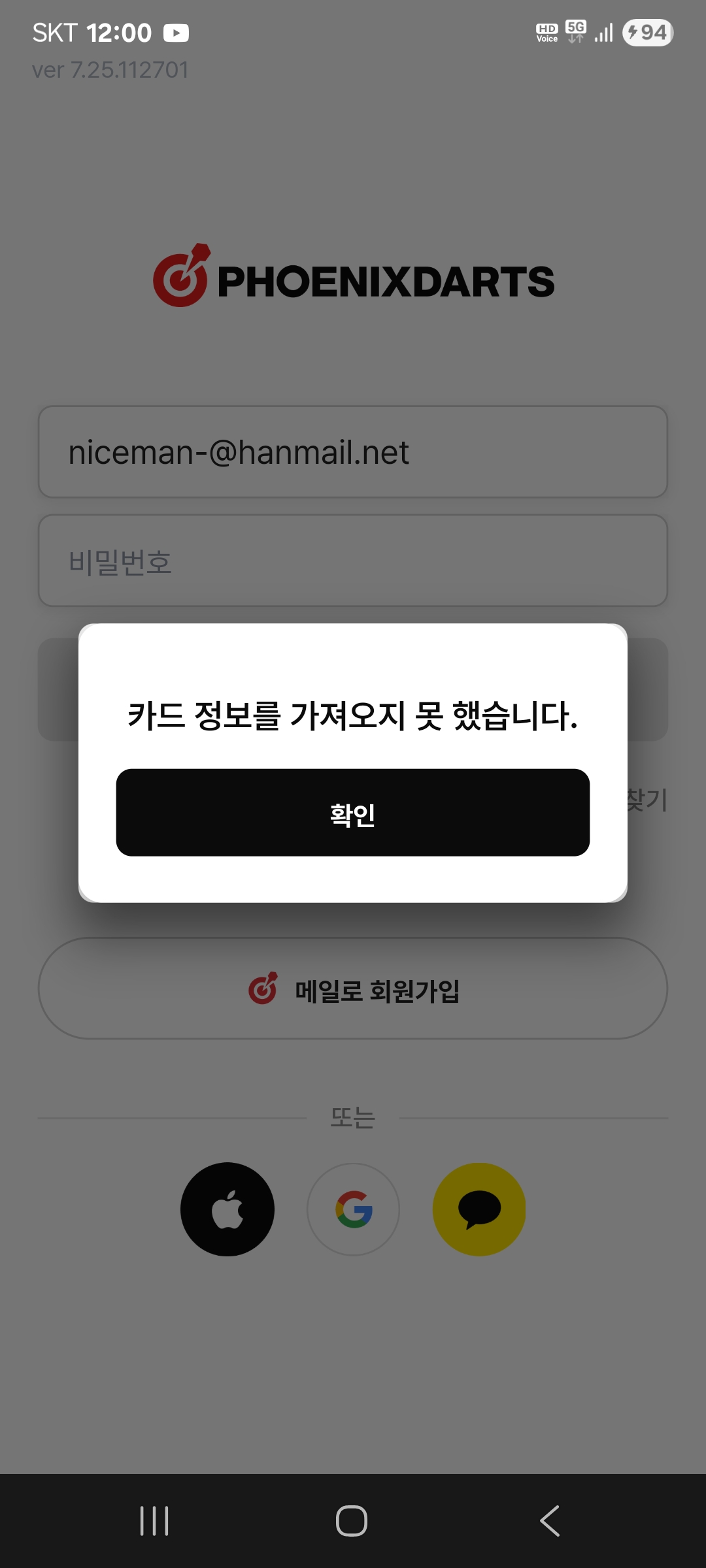 [피닉스다트이용] 피닉스다트어플 13 김병용 | 2025-11-29 첨부파일1 11월28일 부산 501펍에서 다트를 하던중 피닉스다트 어플에 접속을 했는데 "카드정보를 가져오지 못했습니다"라는 문구가 계속 뜨면서 접속이 안됩니다.처리좀 부탁드립니다. 수정 삭제 목록 ▲대회신청 [0] 2025-11-29 ▼아이템 장착해제 방법 [1] 2025-11-26