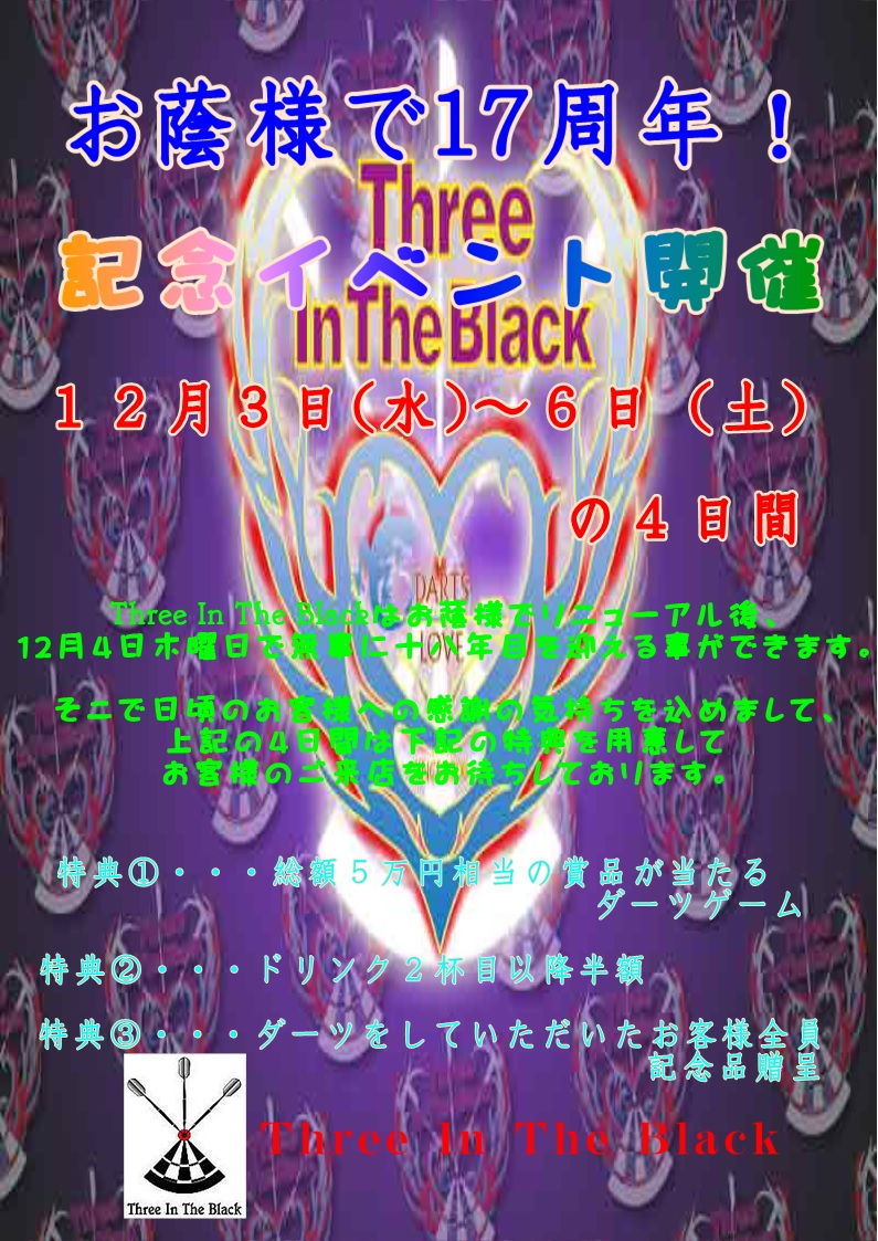 12月4日木曜日、『Three In The Black』無事に十八年目を迎える事ができます。